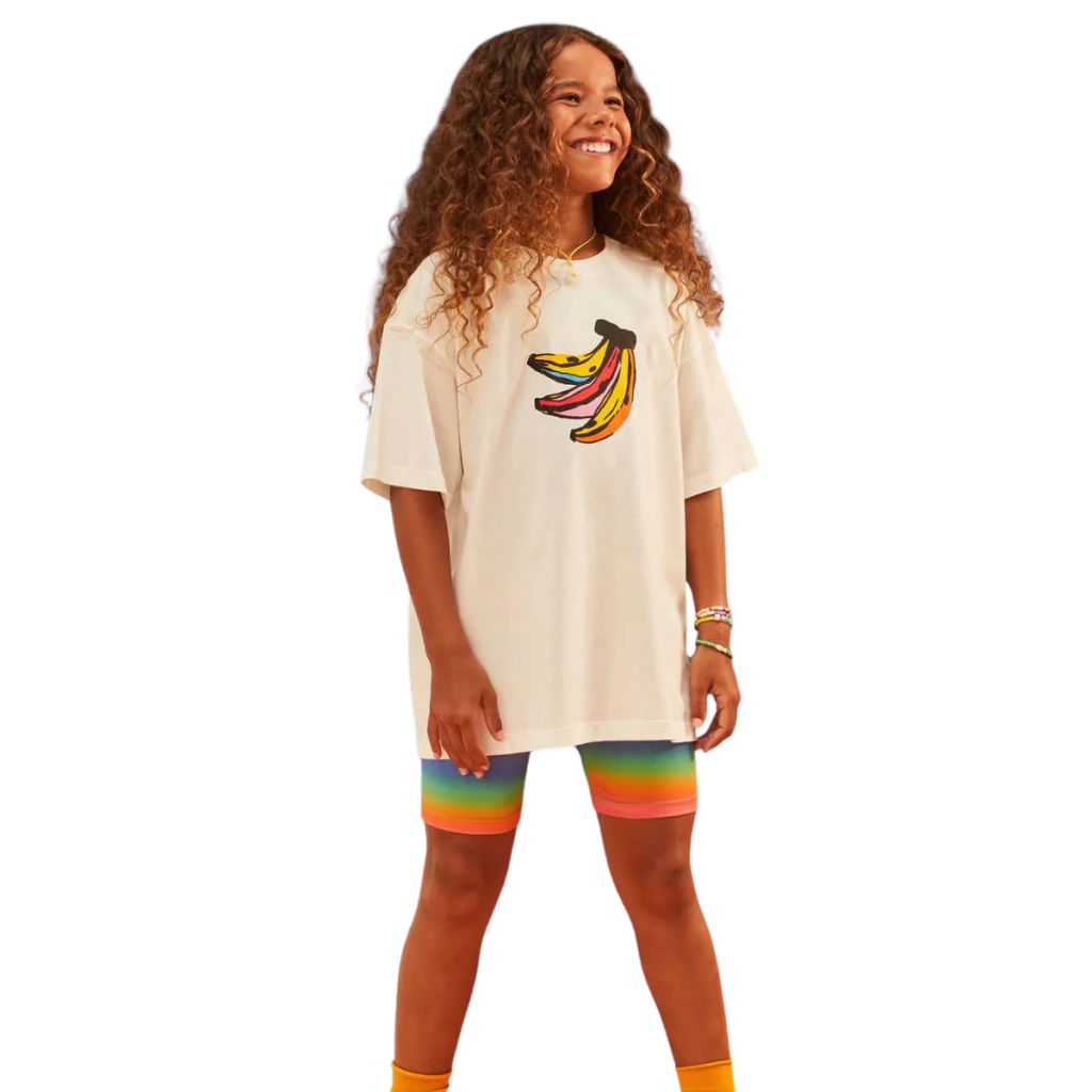 Sua modelagem oversized garante caimento moderno, amplo e confortável, enquanto o silk exclusivo de bananas 🍌 traz a irreverência e o toque lúdico que são a cara da Fábula. A cor off white neutra deixa a peça versátil, perfeita para combinar com shorts, saias ou calças, criando produções criativas e autênticas. 🌈