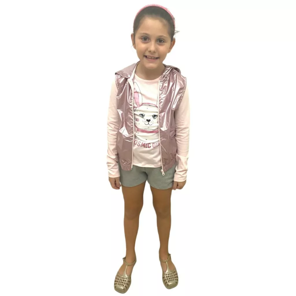 Detalhes do Produto: Conjunto Infantil Kukiê; Blusa manga longa;Short com cós grosso e bolsos nas laterais; Colete Brilhoso;