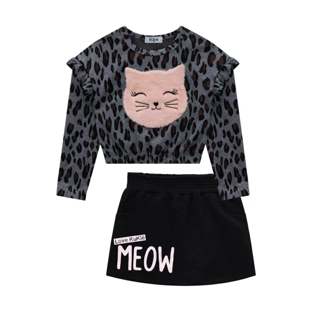 Detalhes do Produto: Conjunto Infantil Kukiê; Manga Longa; Estampa De Gatinho; Short Saia; Cós Grosso; Bolso Na Lateral;