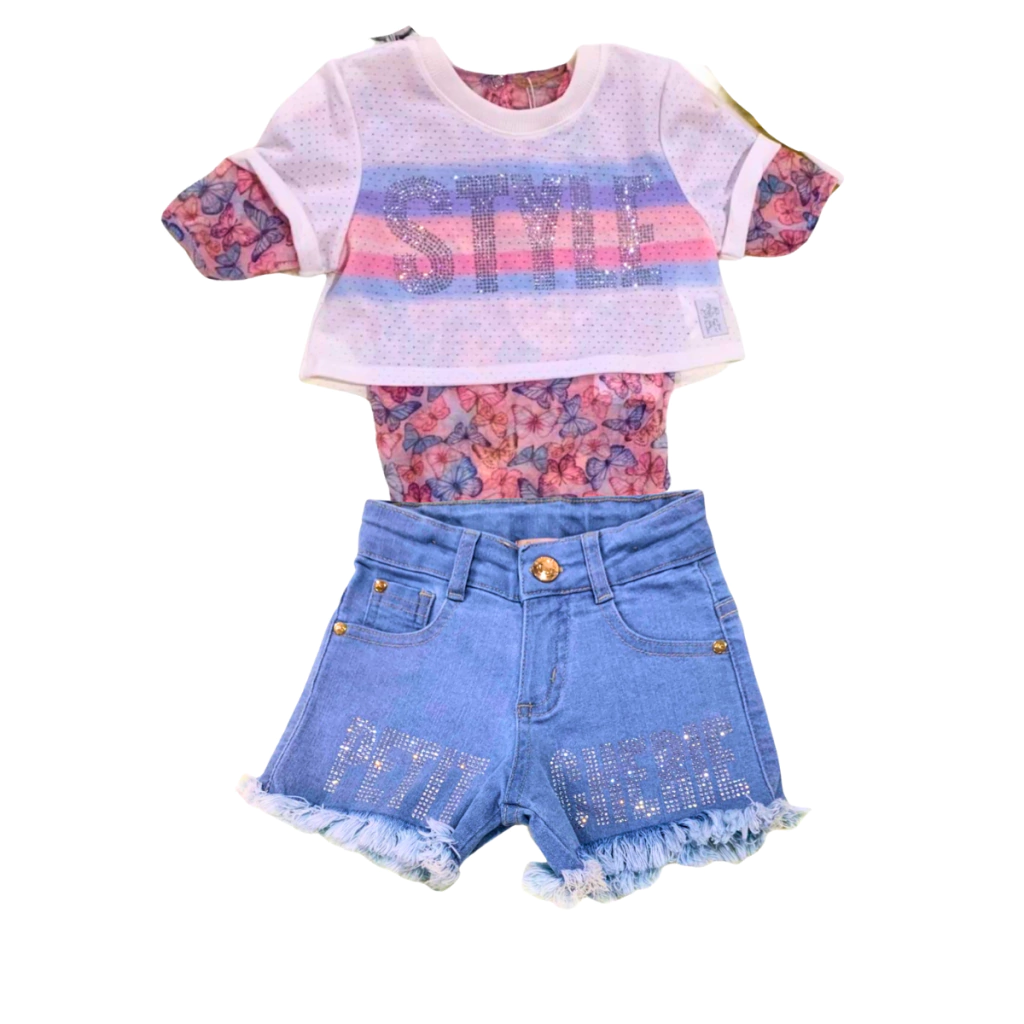 Conjunto Petit Cherie Body e Short Butterfly, possui body confeccionado em viscolycra manguinhas curtas e soltinhas, destaque na linda e delicada estampa borboleta por todo body, fecho com botão de pressão entre as pernas. O short do conjunto infantil menina é confeccionado jeans, possui regulador de medidas interno e espaçador para cinto, o short vem com dois bolsos frontais e traseiros, destaque com detalhe em cristais irisados na parte da frente do short e com lenço para se usar com o cinto ou com amarrações diversas, fecho do short com botão e zíper.