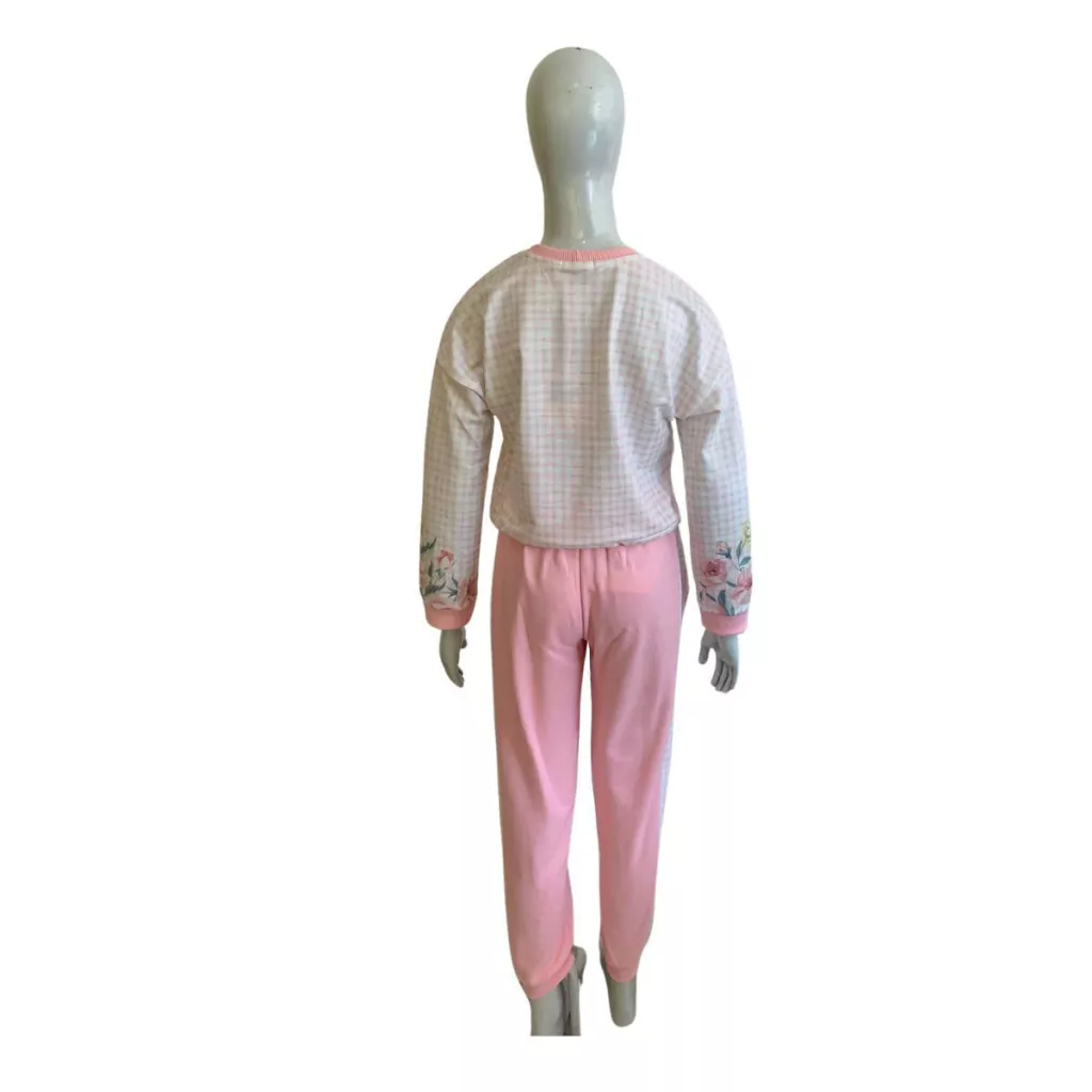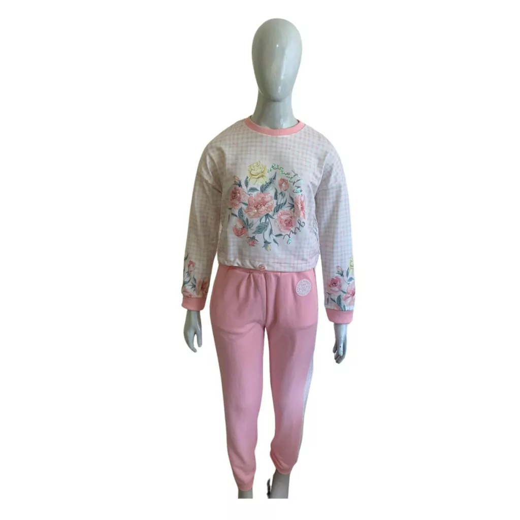 Detalhes do Produto: Conjunto; Calça; Manga Longa; Flores; Rosa Claro;