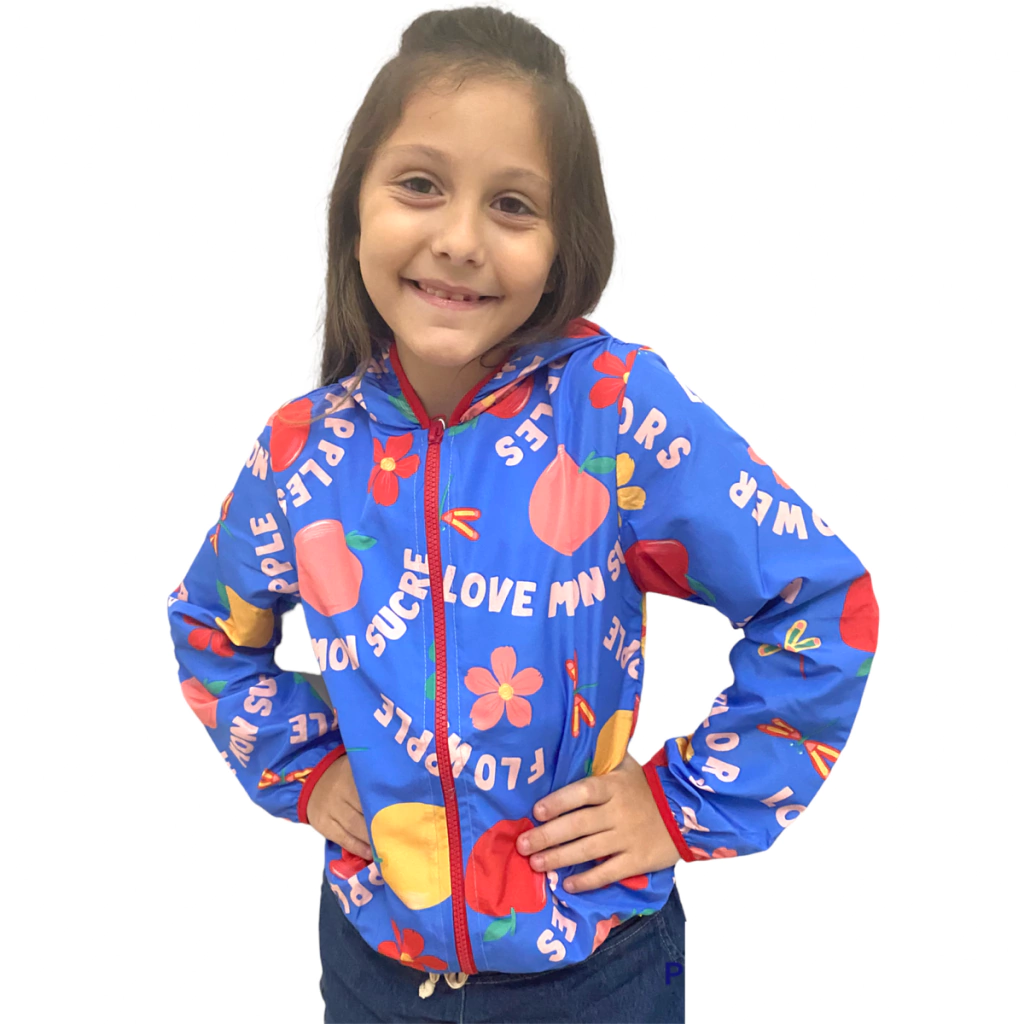 Detalhes do Produto: Jaqueta Corta Vento; Manga Longa com Punho Vermelho; Estampa de Flores, Frutas e Libélulas; Capuz com Borda Vermelha; De Zíper Vermelho;
