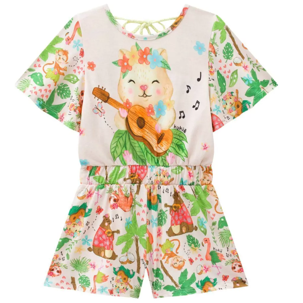 Detalhes do Produto: Macaquinho Kukiê; Estampa Esquilinho; Manga Larguinha; Short Soltinho;