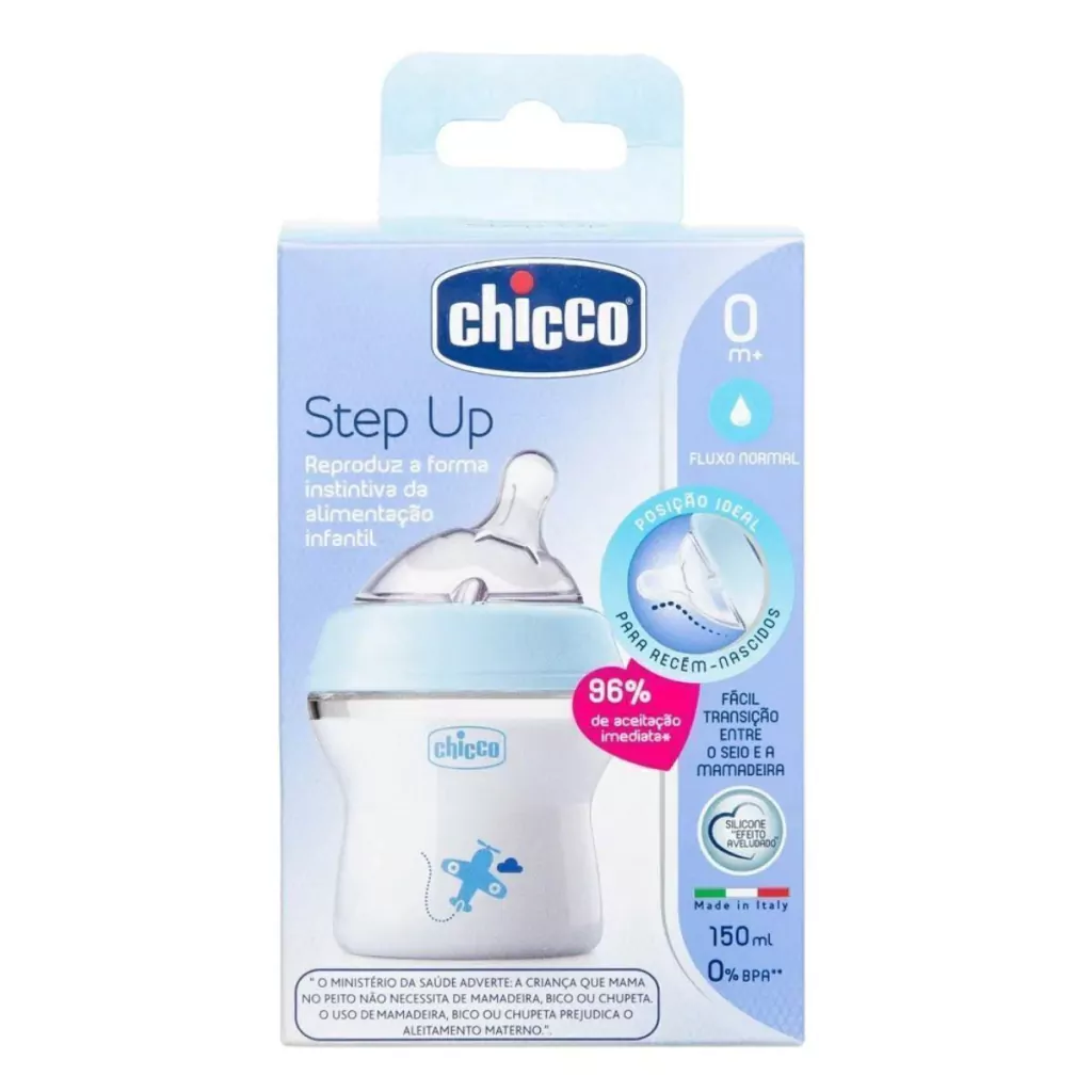 A experiência da Chicco no mundo dos bebês, e sua constante pesquisa, possibilitaram o desenvolvimento da nova linha de mamadeiras e bicos Step Up. Exclusivo bico inclinado. Ideal para a sucção dos recém-nascidos. Permite uma posição para amamentação confortável para o bebê. O bico fica sempre completo com o leite, reduzindo as chances de engolir ar. Tem capacidade de 150ml e possui Bico Fluxo Normal (0m+), ideal para a necessidade dos bebês recém-nascidos.