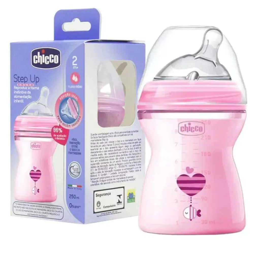 A experiência da Chicco no mundo dos bebês, e sua constante pesquisa, possibilitaram o desenvolvimento da nova linha de mamadeiras e bicos Step Up. Exclusivo bico inclinado. Ideal para a sucção dos recém-nascidos. Permite uma posição para amamentação confortável para o bebê. O bico fica sempre completo com o leite, reduzindo as chances de engolir ar. Tem capacidade de 250ml e possui Bico Fluxo Médio (2m+), ideal para a necessidade dos bebês recém-nascidos.