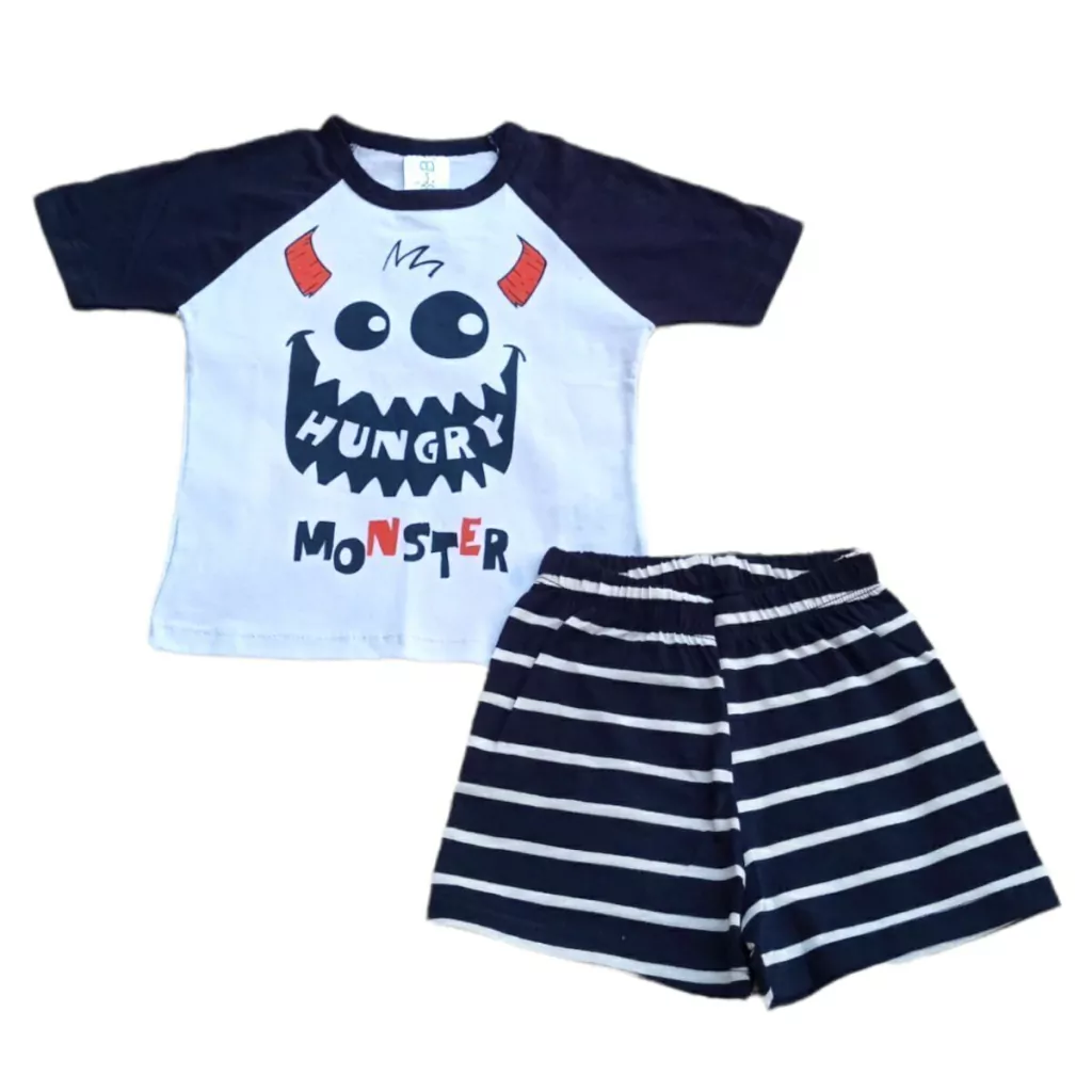 Detalhes do Produto: Pijaminha; Meia Manga; Estampa De Mostrinho; Short; Cós Grosso; Com Listras;