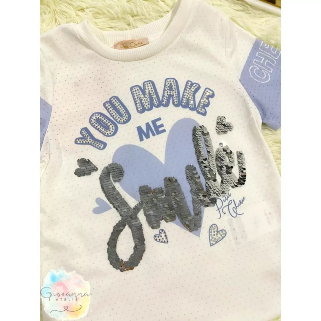 T-Shirt Petit Cherie Infantil Smile Coleção Inverno, com blusa confeccionada em malha laise branca com manguinhas curtas azuis e gola redonda, destaque na parte da frente da blusa com detalhe em paetê escrito: SMILE e em cristais: You Make, confere um toque charmoso e iluminado a peça.