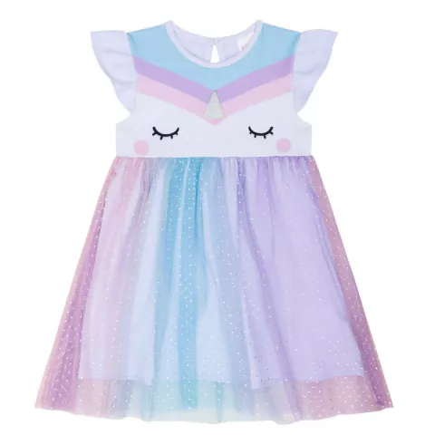 Detalhes do Produto: Estampa de unicórnio com aplicação de glitter no chifre; Mangas com babadinhos delicados; Saia rodada com tule colorido e brilhos ;Fechamento com botão nas costas para facilitar o vestir