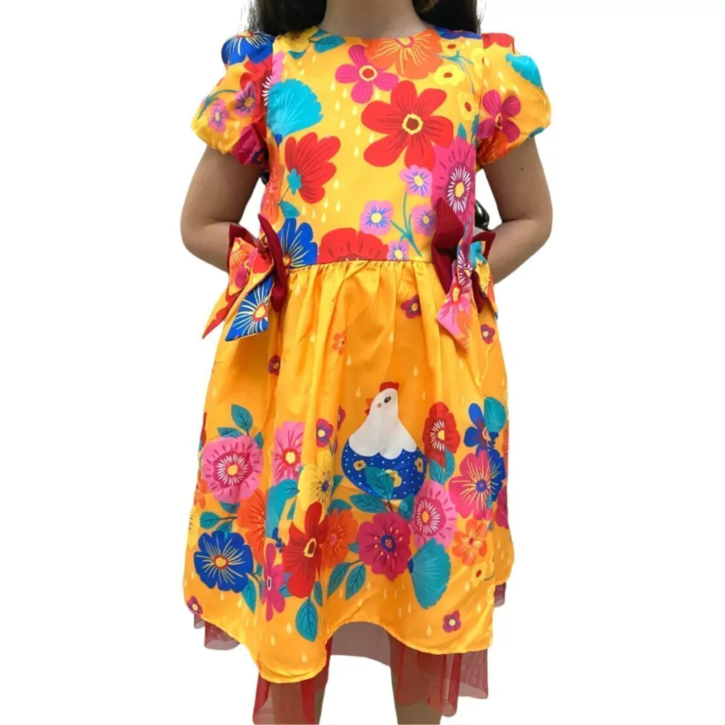 Detalhes do Produto: Vestido Para Festa Junina; Manga Bufante; Estampa Com Galinha E Flores; Um Laço de Cada Lado Da Cintura; Tule Mais comprido em Vermelho na parte de baixo;