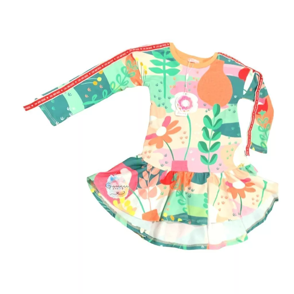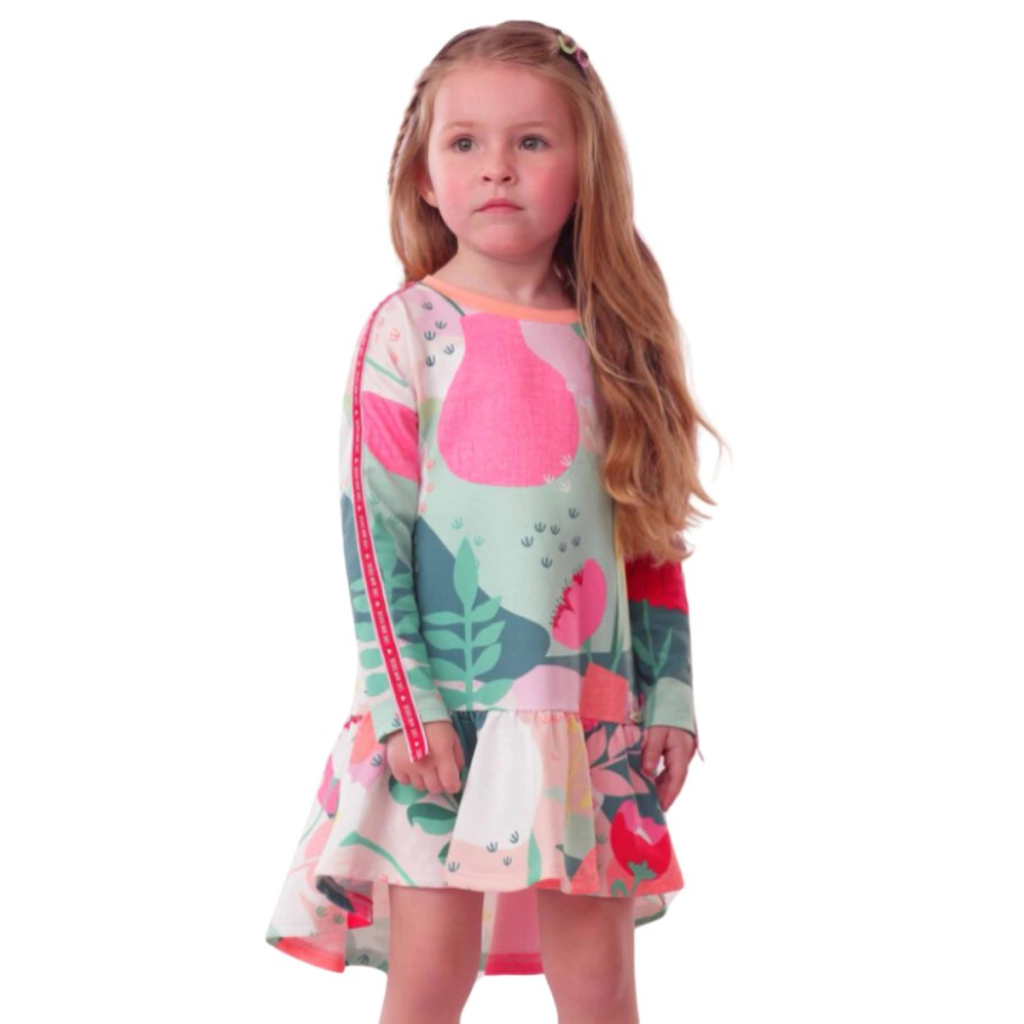 Vestido Mon Sucré Infantil Garden Manga Longa Inverno, é confeccionado em malha com linda e delicada estampa Garden, o vestido Mon Sucre possui modelagem trapézio com mangas longas, destaque nos ombros para fita vermelha aplicada com escrita "Love Mon Sucré, no barrado da saia, leve franzido que confere um efeito mais rodado a saia.