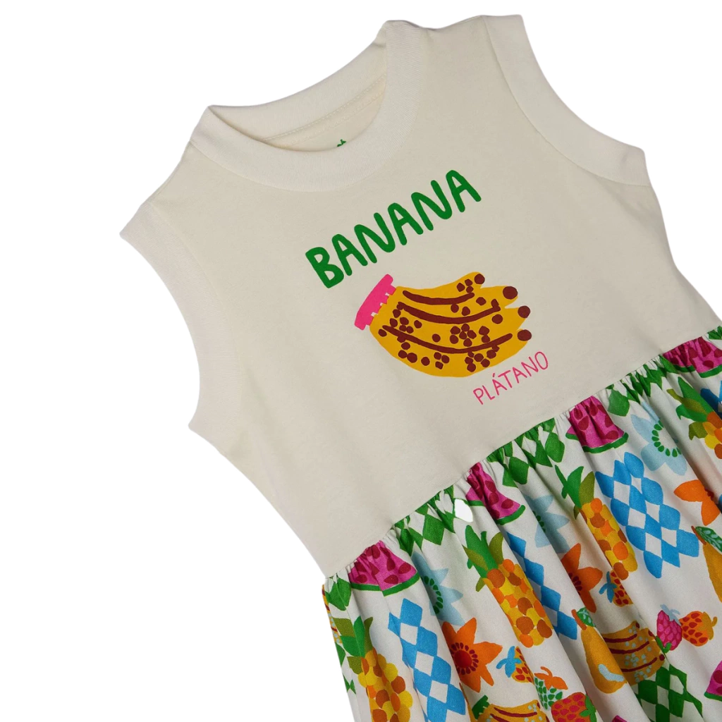 Na cor off white suave, o vestido se destaca com a estampa exclusiva Mucha Fruta, trazendo frutas coloridas e detalhes lúdicos que despertam a imaginação e tornam cada look alegre e divertido. 🌈✨